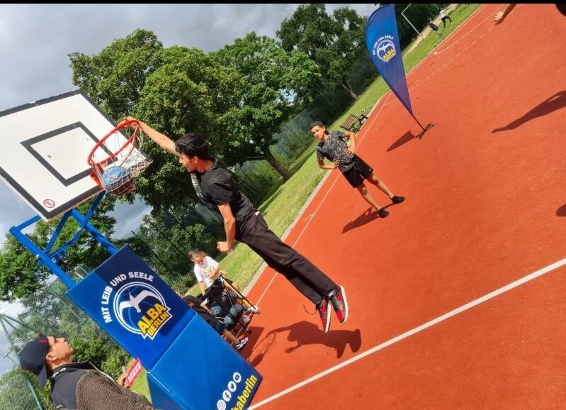 Wenn der Landessportbund zum Sportfest der Willkommensklassen Berlins einlädt, sollten schönster Sonnenschein und ein angenehmes Lüftchen mit von der Partie sein. Schließlich wollen Fußballtore, Basketballkörbe, Tischtennisplatten, Slackline, Weitsprungplatz, Kampfsportmatten, Rennbahnen und vieles mehr ausgiebig bespielt und genutzt werden. Eigentlich.
